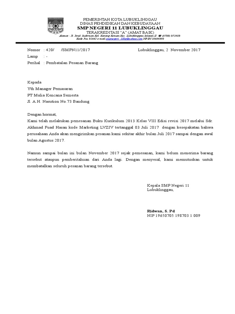 Contoh Surat Niaga Pembatalan Pemesanan Pdf